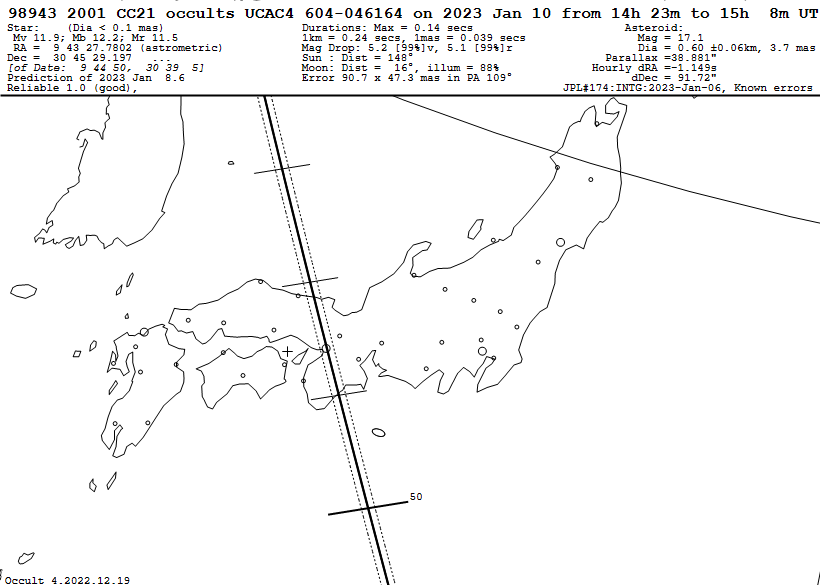 | 02/06 19h43m | HIP 41805 | 7.7 | 08 31 24.058 | +53 07 19.32 | (98943)2001 CC21 | 16.2 | 0.6 | 0.11 | 8.5 | 早水 | 近畿-九州北部 | 詳細ページ 注目 はやぶさ2目標天体, 小型, 継続時間短い |