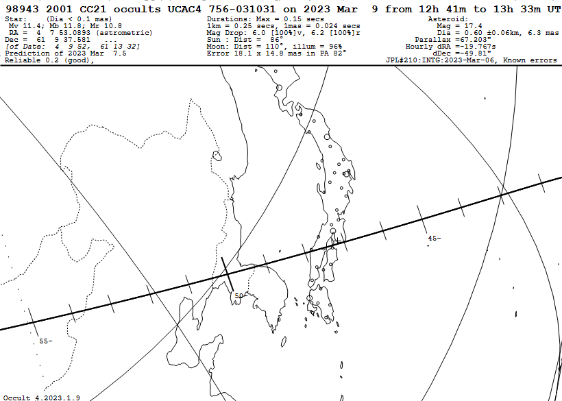 | 03/26 20h45m | HIP 10366 | 5.1 | 02 13 37.188 | +51 03 53.00 | (98943)2001 CC21 | 19.0 | 0.6 | 0.15 | 13.9 | 早水 | 九州南部 | 詳細ページ 注目 はやぶさ2目標天体, 小型, 継続時間短い 恒星位置の信頼性注意(RUWE1.9) |