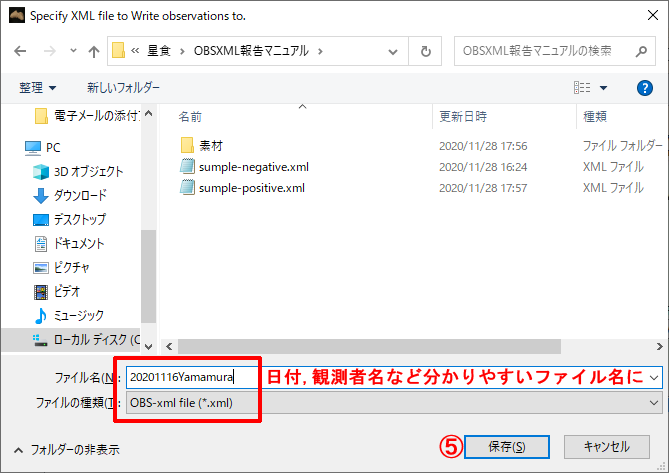 ファイル名には日付や観測者名などの分かりやすい名称を付ける。