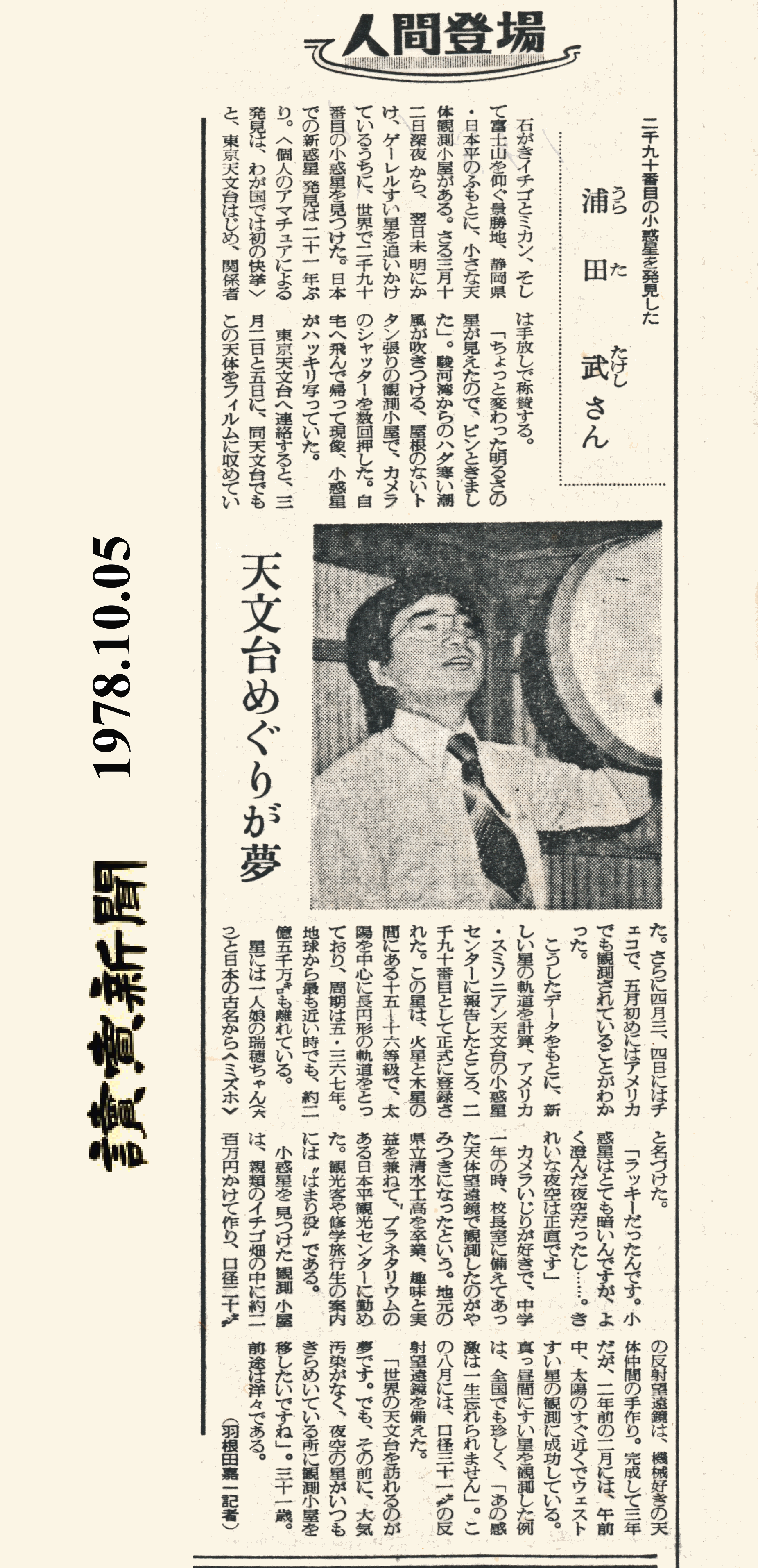 浦田武さんによる小惑星(2090)Mizuho 発見を報道する読売新聞の記事