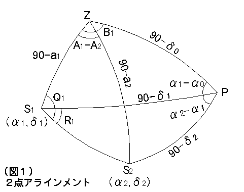 2つの恒星S1, S2 の赤経・赤緯をそれぞれ(α1, δ1), (α2, δ2) とし,その望遠鏡目