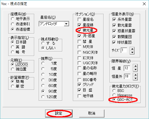 Gsc_Actとした場合、Yoc メニューの「ファイル」→「環境設定」ウインドウの記述は以下の通り。■ ヒッパルコス星表,GSC-ACT星表 の表示方法 少々分かりにくいです。星図を強拡大した時に初めてこれらの星表データが画面に反映されます。 以下は、オリオン座の三ツ星付近で GSC-ACT星表データを表示した例です。 (1) Yoc メニューで微光星の表示設定を行う。「視界」→「設定」で「微光星」と「GSC-ACT」をチェックする。 ヒッパルコス星表を選択する場合には「Hipparcos」にチェックします。